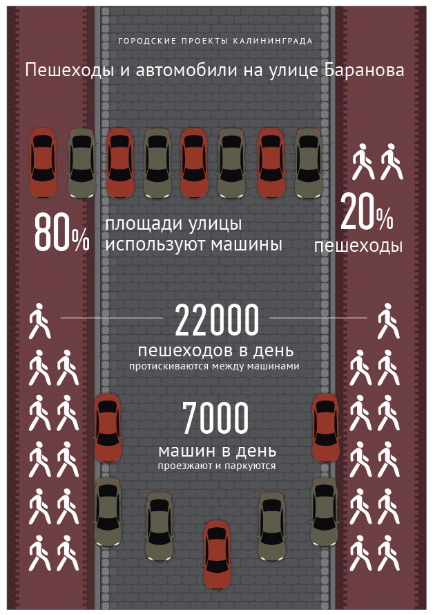 Летом прошлого, в период предвыборной "борьбы" глава Калининграда г-н Ярошук много и подробно говорил о том, что надо сделать наш город удобным и комфортным для проживания. С его уст часто слетала фраза: "Городу нужны пешеходные зоны". В адрес общественных активистов летели тезисы: "Давайте обсуждать. Какие улицы, по-вашему, надо перевести в разряд пешеходных?" С разных сторон в его адрес посыпались те или иные варианты. Наша инициативная группа ("Городские проекты Калининград") решила не оставаться в стороне и сделать свое предложение. Мы посовещались и я решил :), что будем выходить и предложением о том, что статус пешеходной зоны надо дать ул. Баранова.