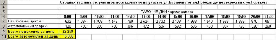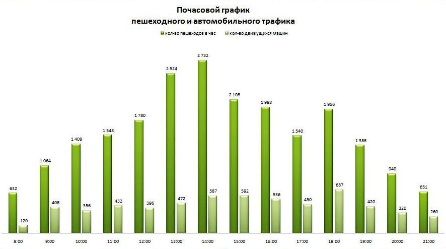 Методика исследования простая: ведется подсчет людей/автомобилей, прошедших/проехавших через данный участок улицы. Данные записываются по каждому часу в течение дня. Подсчет проводился по рабочим дням в промежутке с 8-ми утра до 21-го вечера. Благодаря данному временному параметру, мы смогли отследить дневную динамику потоков.