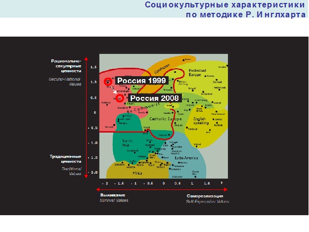 Здесь отображена Россия. Хочу сказать, что экономически успешное направление – это северо-восточный угол. Россия в этом смысле, как обычно, движется парадоксально. Она ухудшает очень высокие показатели, которые у нее были в 1999 году по рациональности, переходя к более традиционным несекулярным взглядам, более религиозным. Но, с другой стороны, она движется в сторону большего предпочтения самореализации, то есть в этом смысле в правильном направлении. А вот это более операциональные вещи: