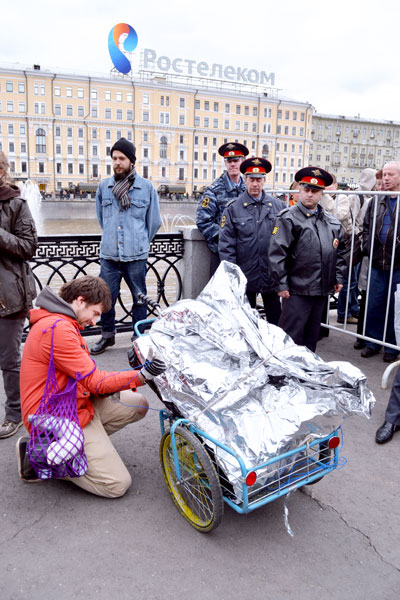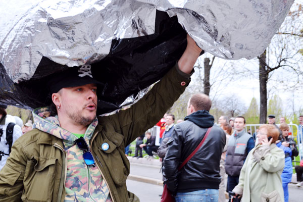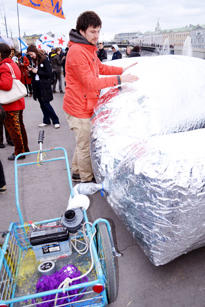"Партизанам" удалось отловить стоявших у рамок организаторов, которые, услышав про идею с пилой, сразу же уладили проблему с проходом. Полиция согласилась пропустить тележку с условием, что скульптура будет надуваться под их пристальным наблюдением.