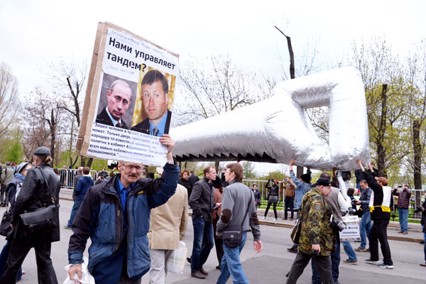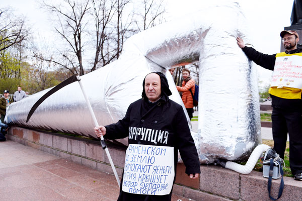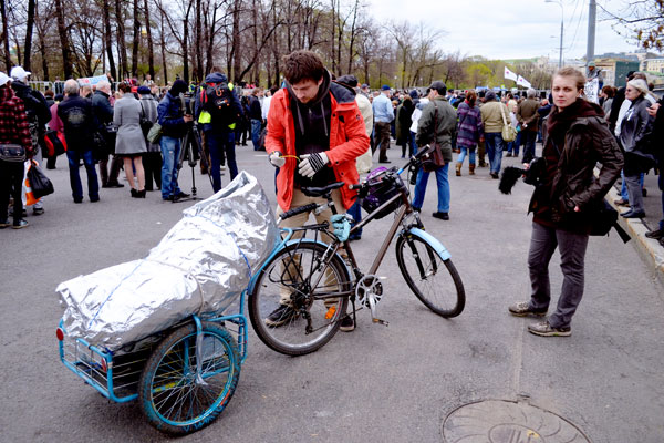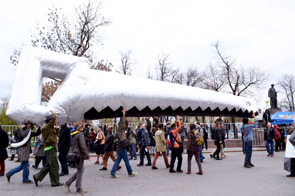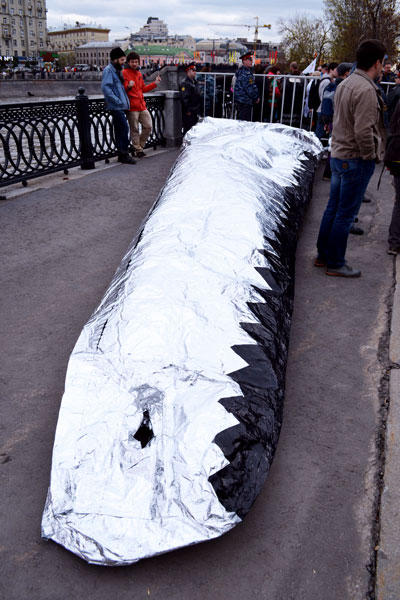 Во время митинга 6 мая по Болотной набережной плавала гигантская надувная пила — символ распила бюджета и коррупции в современной России. Эту скульптуру смастерил немецкий художник Артур Ван Бален во время своего приезда в Москву. Он участвовал в конференции "ДелайСаммит" и заодно решил поддержать российское протестное движение вот таким вот способом.