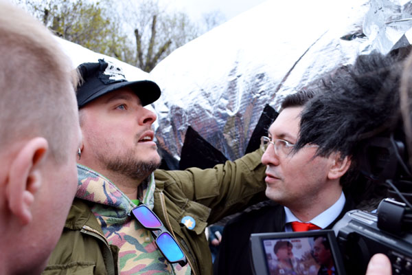 По пути к сцене на Дельфинова напал бывший лидер ДПНИ Александр Белов (Поткин). Он прислонился к поэту и начал угрожающе шипеть: "Кто вы такие? Чего хотите? Согласована ли акция?" Но как только Дельфинов объяснил ему истинное предназначение пилы, быстро отстал.