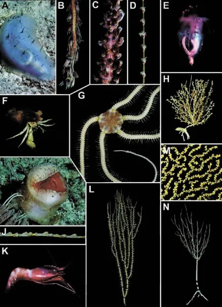 Голотурия Hansenothuria benti, (B) мягкие кораллы Protoptilum sp., (C) Halipteris sp. и (D) Calibelemnon sp. или Stylatula sp., (E) голотурии Enypniastes eximia (F) не описанная ранее актиния рака-отшельника (Anthozoa: Actinaria), (G) офиура Ophiochiton ternispinus, (H) коралловый полип Acanella sp., (I) актиния Actinoscyphia sp., (J) мягкий коралл Lepidisis sp., (K) креветка Parapandalus sp. (Malacostraca: Decapoda: pandalidae), (L) бамбуковый коралл Isidella sp., (M) шестилучевой коралловый полип Parazoanthidae n. gen., n. sp., (N) бамбуковый коралл Acanella sp.