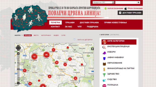 Платформа представляет собой карту Македонии, на которой расположены отметки, соответствующие сообщениям о коррупции. Последние распределены по категориям, что облегчает поиск нужных событий. Сервис обладает поразительным количеством способов отправки сообщений. Есть возможность не только позвонить в call-центр, отправить SMS, написать по электронной почте или заполнить форму на сайте. Для молодых волонтеров предусмотрена отправка информации о коррупции через приложение для Android и iPhone или сообщение со специальным хэш-тегом в Twitter. Что ж, такое внушительное количество способов участия способно значительно увеличить охват сервиса и дополнить карту коррупции Македонии.