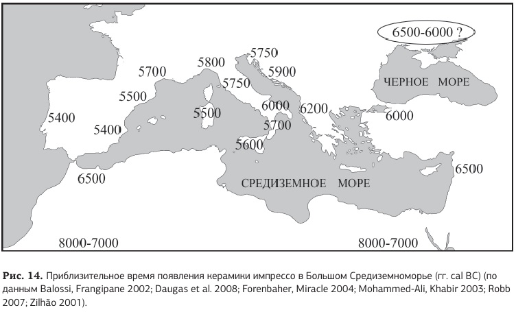 Приблизительное время появления керамики импрессо в различных регионах Средиземноморья Керамика периода Гхар-Далам характеризуется как локальный вариант керамики импрессо (кардиум). Этот тип керамики, получивший своё название от того, что на посуду, наносился штампованный орнамент (как правило – при помощи раковин Cardium), широко распространён на островах и побережьях Западного Средиземноморья, а также на атлантическом побережье Пиренейского полуострова. Считается, что такая керамическая традиция возникла в Гебале (Библе) в IX тыс. до н.э., откуда мигрировала в Македонию (Пре-Сескло), а оттуда распространилась в Западном Средиземноморье и в Адриатике (культуры Данило и Хвар).