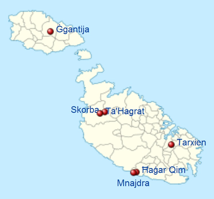 Карта Мальты с наиболее известными храмами Строительство храмов на Мальте началось намного раньше, чем в континентальной Европе (древнейший из известных – Cairn de Barnenez, Финистер, Франция, 4500 г. до н.э.), а, значит, мальтийские мегалиты во многом являются прототипами для памятников других регионов. Очевидным является и тот факт, что культуры доисторической Мальты во многом связаны с Сицилией, поэтому археологи предполагают, что Мальта была культовым центром народов сицилийского неолита-палеометалла. Историки определили, что мегалитические храмы Мальты, подобно другим мегалитам Западной и Южной Европы служили археоастрономическими визирами, отсекавшими пучок света при восходе Солнца в дни солнцестояний, а также в дни равноденствий, что достаточно редко встречается на мегалитическом ареале.
