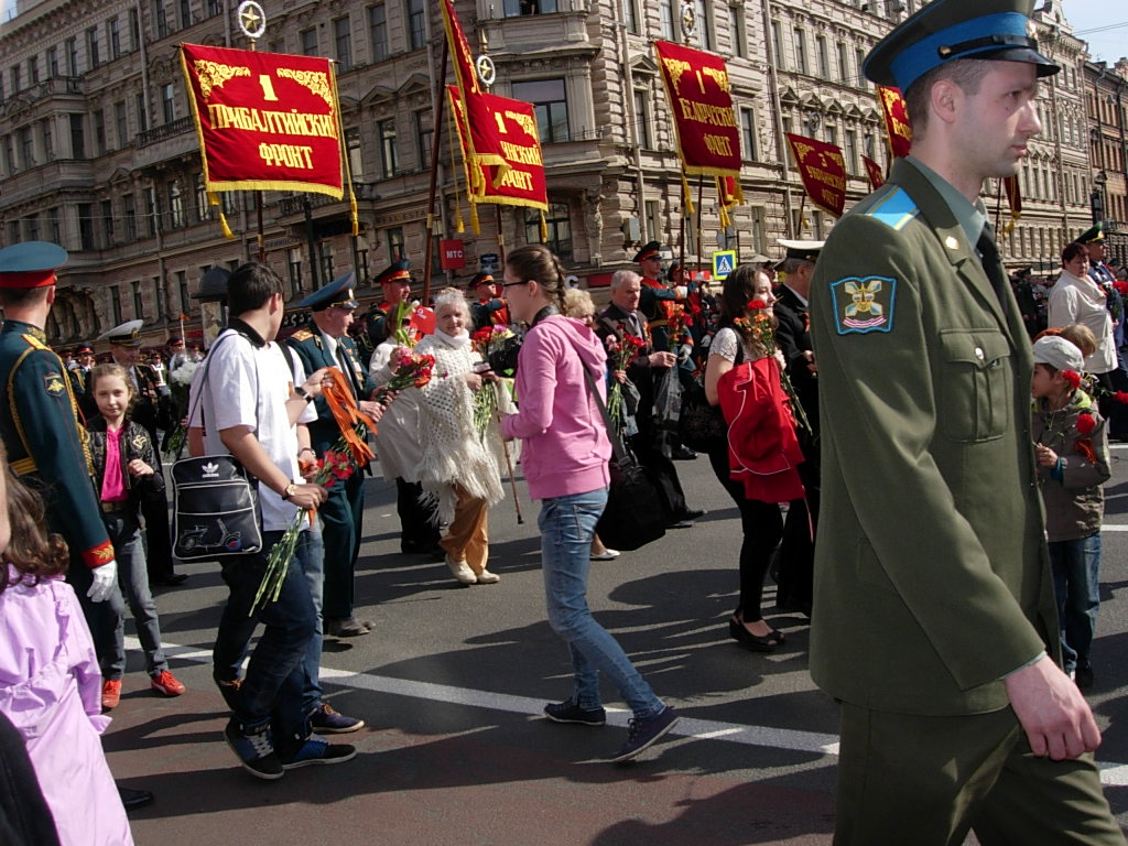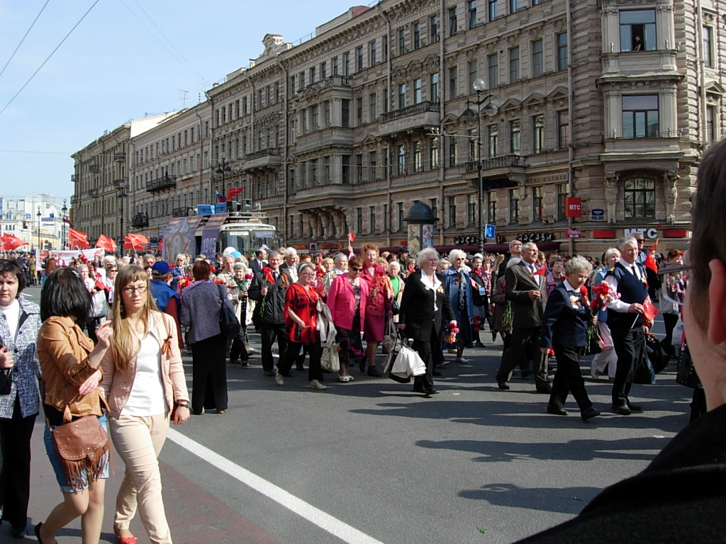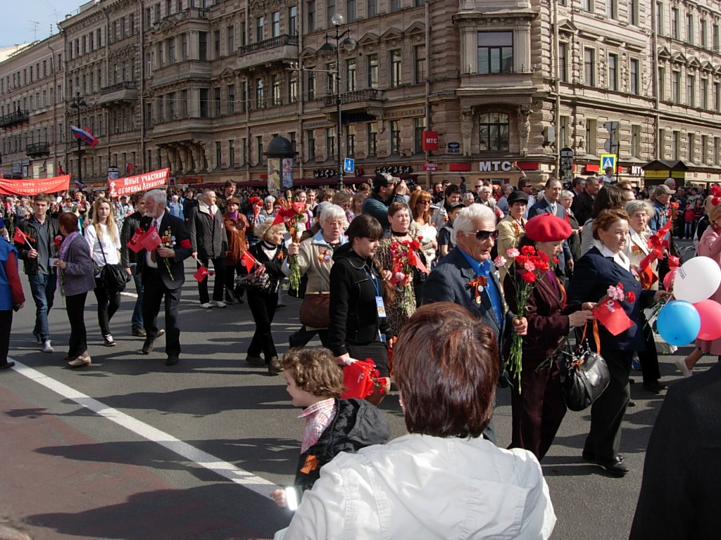 Среди массы праздничных мероприятий, посвященных Дню Победы, проходящих 9 мая в Петербурге, одно можно назвать самым любимым и молодежью, и детьми, и старшим поколением. Это торжественный проход по всему Невскому проспекту ветеранов войны и жителей блокадного Ленинграда. С каждым годом их все меньше, с каждым годом им все труднее пройти такое огромное расстояние, но они снова идут по Невскому, и дети выбегают к ним навстречу с цветами, и люди теснятся на тротуарах, ждут, иногда по целому часу, когда появится колонна. Ни один праздник никогда не собирает столько народа – только в этот день по Невскому не пройти, он от начала до конца заполнен людьми.