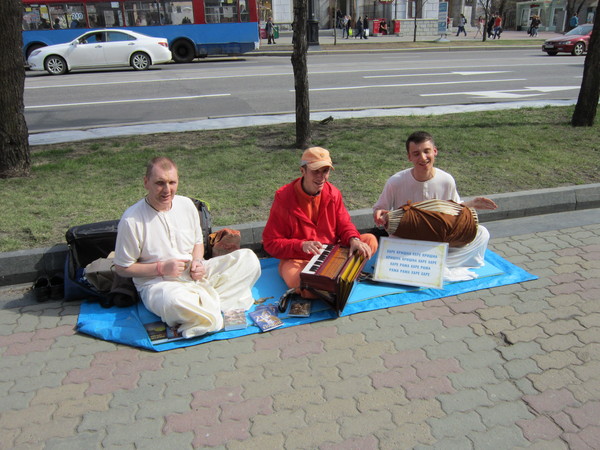 Однако поющие кришнаиты с барабанами, да еще в своей "рабочем" одеянии совсем не напоминали мне научных сотрудников какого-нибудь хабаровского НИИ, работающих над созданием научного продукта.