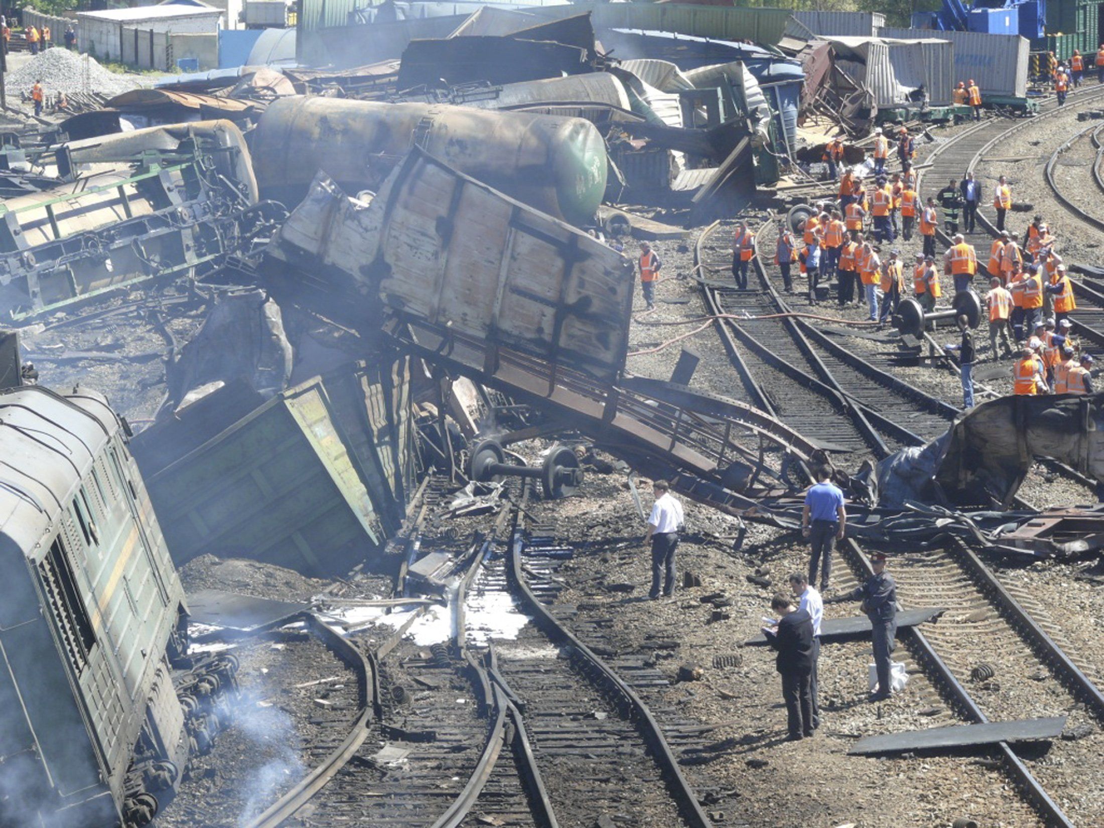 В ночь на четверг при заходе на станцию загорелся локомотив товарного поезда, произошел взрыв, пожар охватил весь состав, более 50 вагонов, в том числе цистерны, сошли с рельсов.