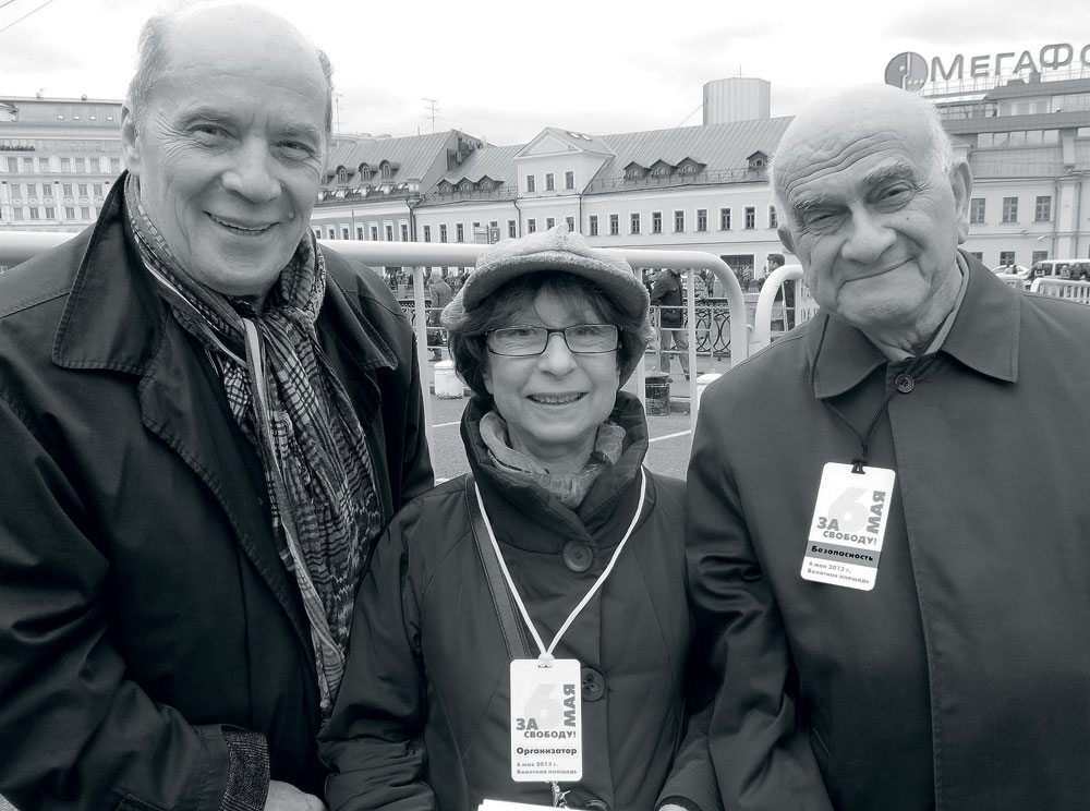 Народные артисты России Лия Ахеджакова и Александр Филиппенко и научный руководитель Высшей школы экономики профессор Евгений Ясин (крайний справа) на митинге «За свободу» 6 мая на Болотной площади в Москве. На пропуске Ясина написано «безопасность», на пропуске Ахеджаковой — «организатор».