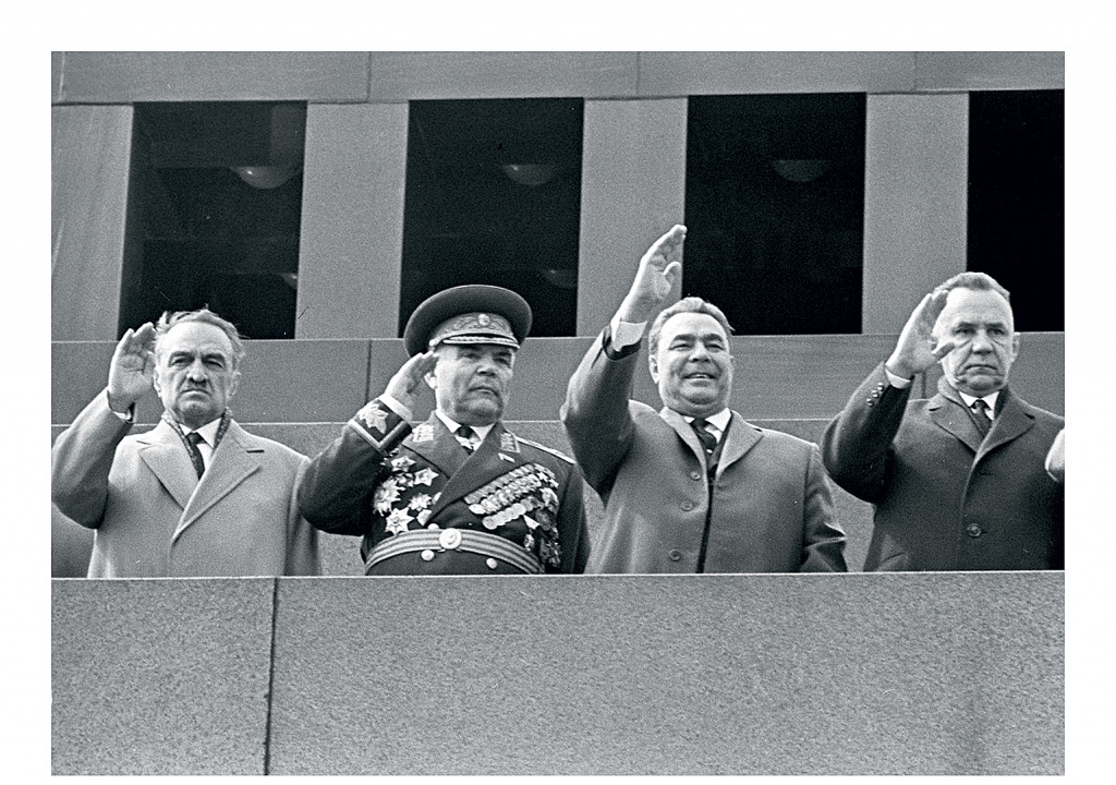 Анастас Микоян, Родион Малиновский, Леонид Брежнев и Алексей Косыгин на военном параде на Красной площади. 9 мая 1965 г.