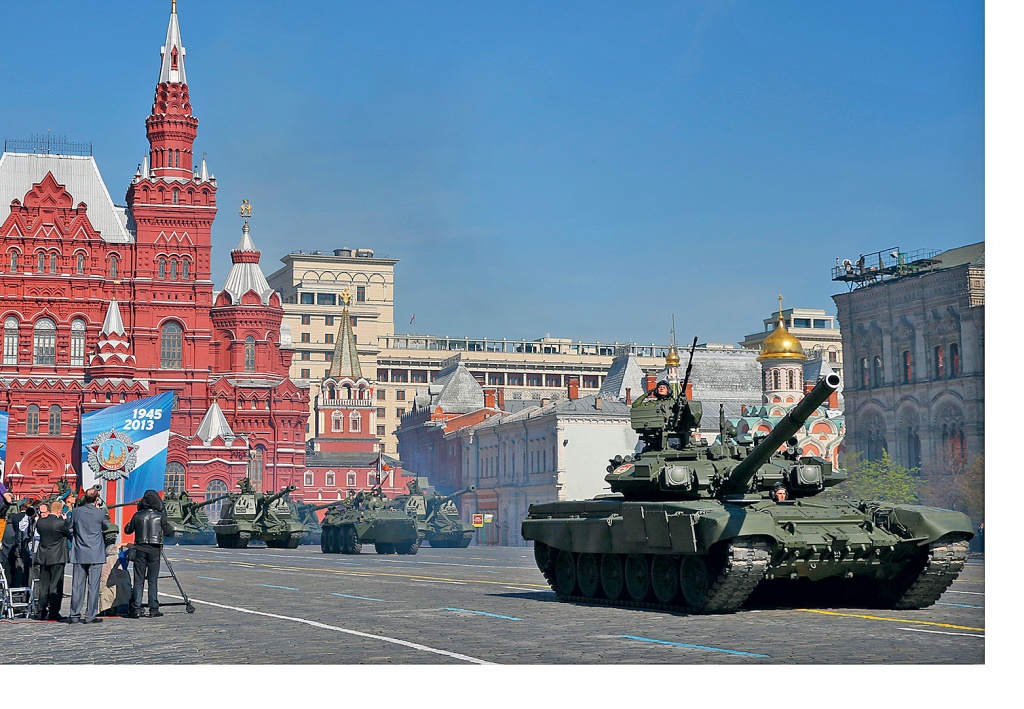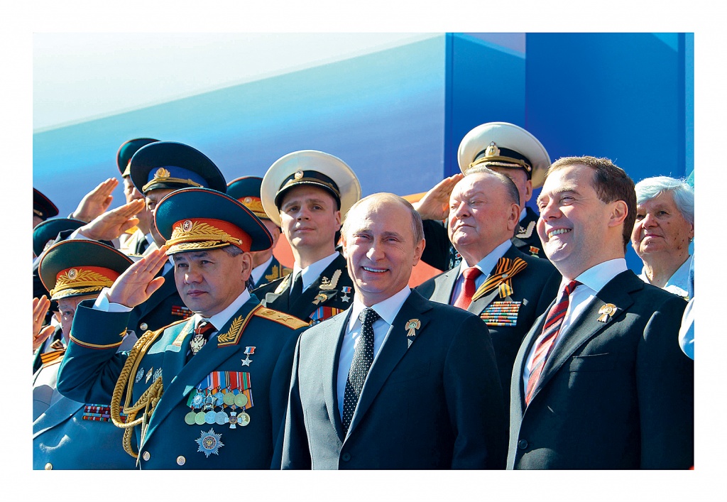 Сергей Шойгу, Владимир Путин и Дмитрий Медведев на военном параде на Красной площади. 9 мая 2013 г.