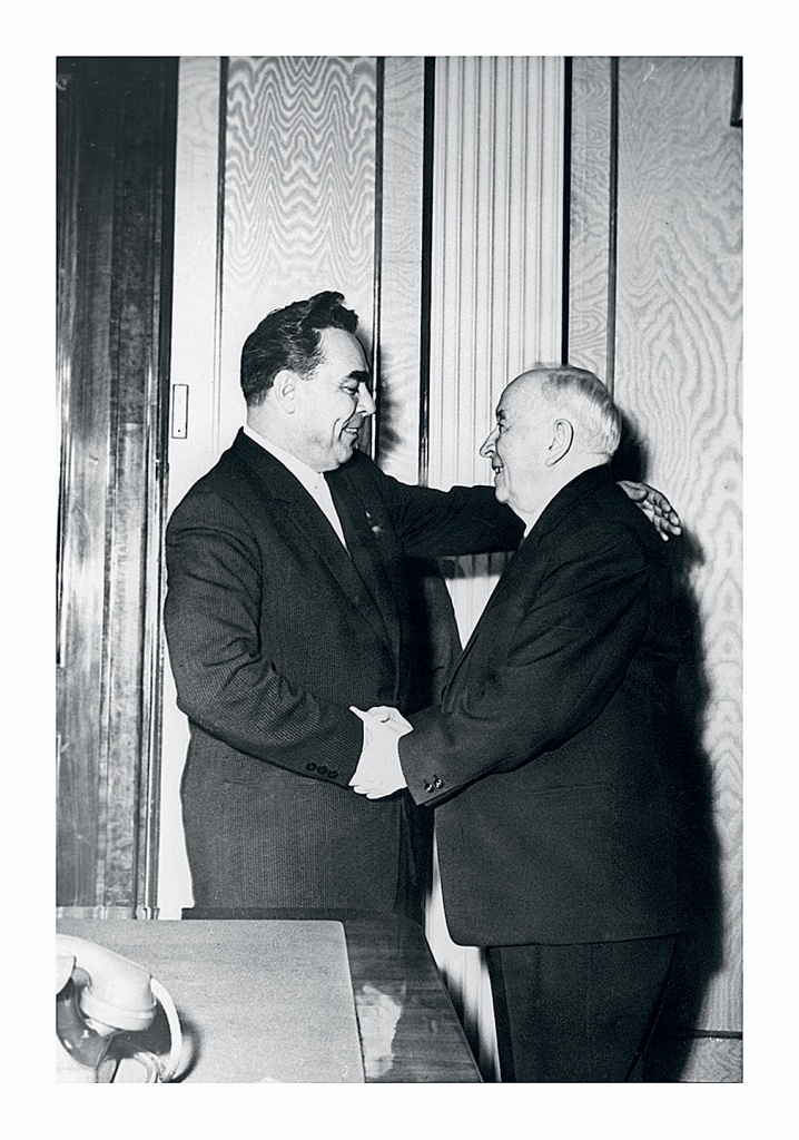 Леонид Брежнев награждает финского и советского политического деятеля, писателя Отто Куусинена званием Героя Социалистического Труда. 5 октября 1961 г.