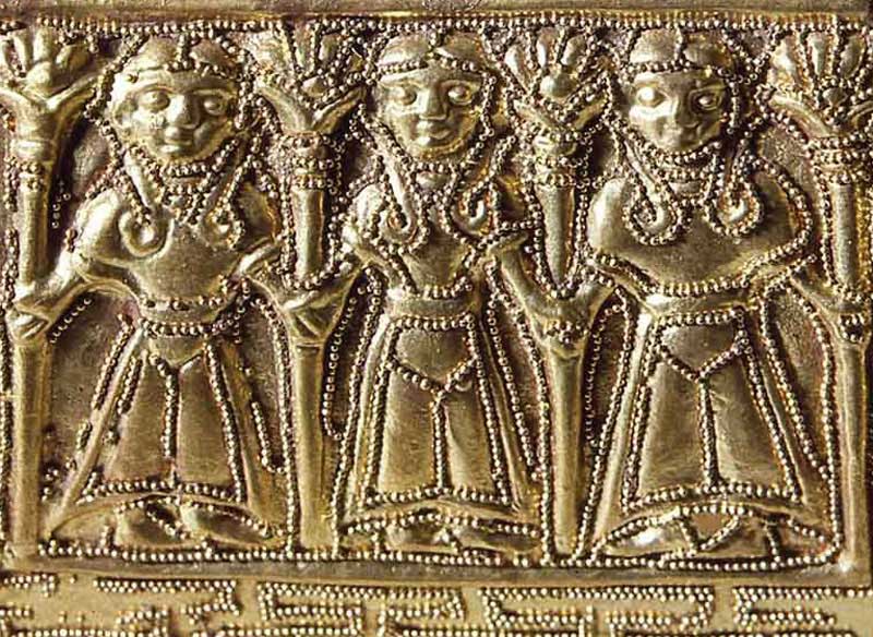 Деталь золотого браслета с триадой богинь Раскопки на острове Даскалио (близ Кероса, 2800-2200 г. до н.э.) открыли сотни сломанных статуэток и преднамеренно уничтоженной посуды. В данном случае речь может идти или о подношениях умершим, или о ритуальном уничтожении личных врагов либо военных противников. Керос в бронзовом веке был ритуальным центром, а поселение на Даскалио – пристанищем паломников. Неизвестным культовым целям служили и обнаруженные здесь наборы яйцевидных галек. На Даскалио обнаружено святилище со стенами 16х4 м. Найденные в нем бронзовые топоры также были культовыми предметами, спрятанными на время осады города. В текущем археологическом сезоне планируется продолжить обследование Кероса, которое позволит выявить новые памятники. Как предполагает Колин Ренфрю, можно говорить даже о существовании в III тыс. до н.э. на Кикладах конфедерации племен с центром на Керосе.