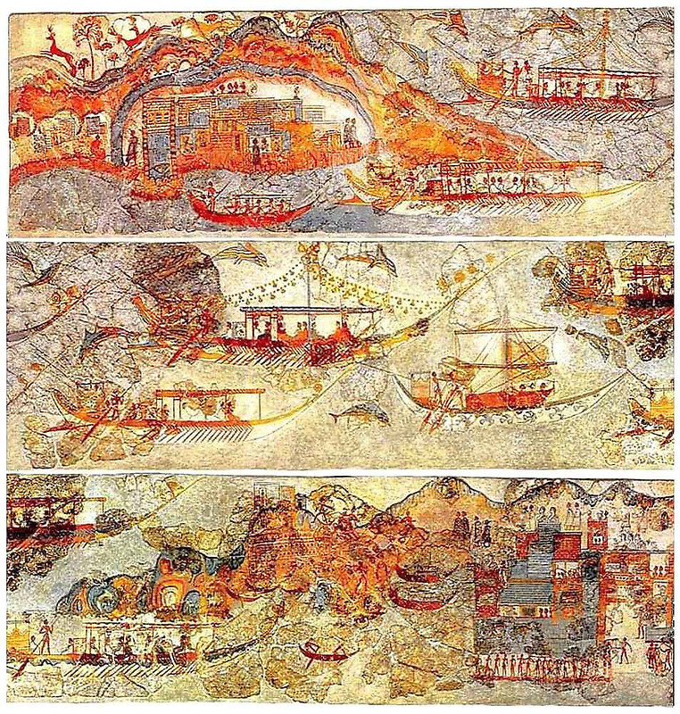 Фрески из Акротири На морской характер неолитической эгейской культуры однозначно указывают многочисленные (более сотни) изображения кораблей на Андросе. Они локализуются на крепостной стене, в святилище, на скалах к северу от города. О характере культа свидетельствуют изображения лодок, звезд, а также сцены охоты на оленя. Аналогичное святилище известно также на Наксосе. По мнению Кристины Телеванту, большинство лодок андросского святилища обращены к городским воротам. Другое святилище было обнаружено в пределах городской стены. На камнях, из которых сложены его стены, также есть много изображений лодок, рыб, водоплавающих птиц, а также схематичные рисунки мужчин и женщин. Из орнаментальных мотивов в нем преобладают спирали. Помимо Андроса, спирали были выявлены на островах Гераклея, Наксос, Астипалая, а также в материковой Греции (Маронея, Асфенду, Сикурион, Пангайон). Также здесь были обнаружены каменные амулеты и антропоморфные идолы в позе адорации. В гравюрах Андроса представлены все основные мотивы и темы, популярные в Эгеиде в Бронзовом веке как на фресках, так и на керамике: