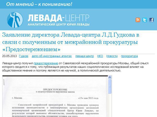 23 апреля прокуратура Москвы в рамках массовых проверок НКО запросила документы у «Левада-центра», который в прошлом году отметил свое 10-летие. От организации потребовали предоставить документы, касающиеся разных аспектов деятельности организации, в том числе, выполнения обязательств перед иностранными грантодателями. По итогам проверки Генпрокуратура выяснила, что с 26 декабря 2012 года по 24 марта 2013 года «Левада-центр» получил из-за рубежа 3,9 млн рублей, в частности от американского института «Открытое общество», а также от организаций из Италии, Великобритании, Польши и Кореи.
