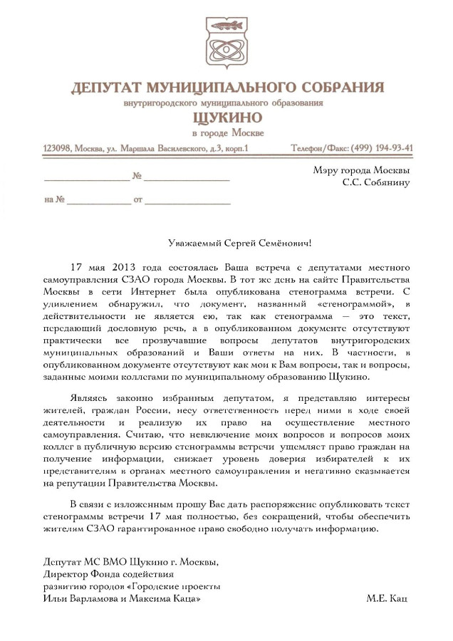 Я направил мэру письмо на этот счет, объяснил, что такое стенограмма, и предложил исправиться. Понятное дело, что лично он тут ни при чем, но люди, работающие в его аппарате, вот так видят политическую деятельность. Мы будем светить в их мелкие (и крупные) пакости нашим прожектором :)
