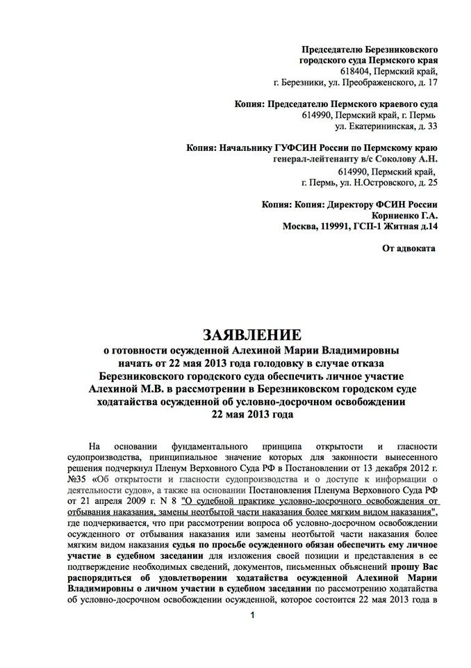 На днях на странице в социальной сети Facebook другой участницы Pussy Riot Надежды Толоконниковой появилось сообщение о том, что Мария Алехина готова 22 мая начать голодовку протеста в случае, если ее не этапируют из колонии в здание суда во время рассмотрения вопроса об ее условно-досрочном освобождении. Муж Толоконниковой Петр Верзилов заявил в интервью агентству "Интерфакс", что письмо о намерении Алехиной объявить голодовку уже направлено как в Березниковский суд, так и в Пермский краевой суд, а также в органы ФСИН.