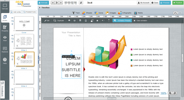 Easy Web Content Presenter – это очень полезное и мощное веб-приложение для профессионального создания презентаций в Интернете. С помощью Easy Web Presenter, вы можете не только создавать веб-презентации, но еще и инфографику, баннерную рекламу, тизеры, демонстрации продуктов, графики и диаграммы, макеты и многое другое.