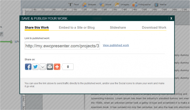 После окончания работы над презентацией вам необходимо сохранить ее в своем профиле нажатием на кнопку Save. Затем вы можете поделиться ей со своими коллегами, отправив им специальную ссылку, или вставить работу в свой сайт или блог с помощью встраиваемого кода. Кроме этого, можно отправить презентацию по электронной почте и даже загрузить на свой компьютер в виде изображения (JPG) или электронного документа (PDF).