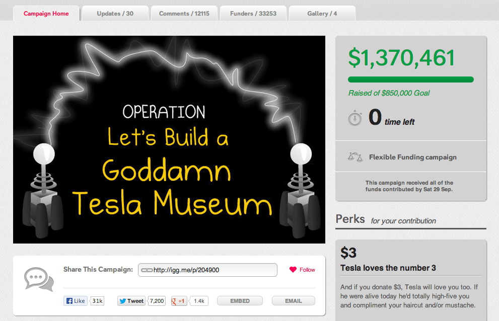 Недавно The Oatmeal поделился радостными новостями — компания, получившая ёмкое название «Let’s Build a Goddamn Tesla Museum» (Давайте построим проклятый музей Тесла), закончилась успехом!