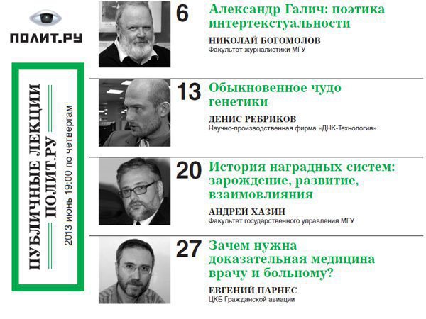В июне 2013 г. выступят филолог Николай Богомолов, биолог Денис Ребриков, историк Андрей Хазин и врач Евгений Парнес. Проект «Публичные лекции "Полит.ру"» начал работу 25 марта 2004 года. Это площадка содержательной коммуникации по проблемам, находящимся на переднем крае науки, культуры и общественной дискуссии. Особое внимание уделяется истории, современности и будущему России и мира. Проект закладывает основания для формирования гражданской позиции.