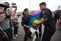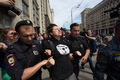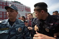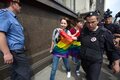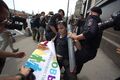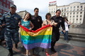 В парке Горького задержаны участники "Радужного митинга" за равноправие ЛГБТ. Как сообщает корреспондент "Граней", около 50 активистов успели дойти до гайд-парка до прибытия туда полиции. Около 10 человек развернули плакаты и простояли около 5 минут, дискутируя с гомофобами, которые грозили им административной ответственностью за пропаганду гомосексуализма, но не нападали. Как только подъехала полиция и началось задержание участников пикета, на них напали гомофобы, которых полиция тоже задержала и рассадила в разные автобусы. Уже после задержания основного пикета один человек встал в одиночный пикет, и его сразу задержали.