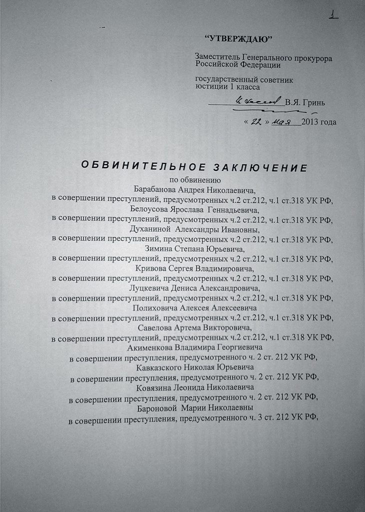 Первая страница обвинительного заключения по «Болотному делу»