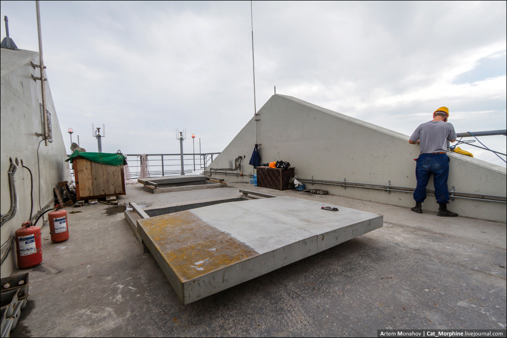Мост выше облаков! Огромный, кажется, нереальный мост! Прекрасный вид и кругом океан. Я не верю своим глазам, это великолепное чувство, когда хочется закричать от восторга, хочется обнять отдыхающих рабочих, но нельзя. Все нужно держать в себе, иначе могут заподозрить. Максимальная серьезность на лице и пара вопросов рабочим — делаем вид, что мы здесь по делу. Как можно быстрее снимать, один, два, три кадра, вот они, вот они мегабайты, ради которых пришлось проделать 10 000 км. И все, 20 минут наслаждения и 324 метра высоты, через 5 минут снова бегом по лестнице.