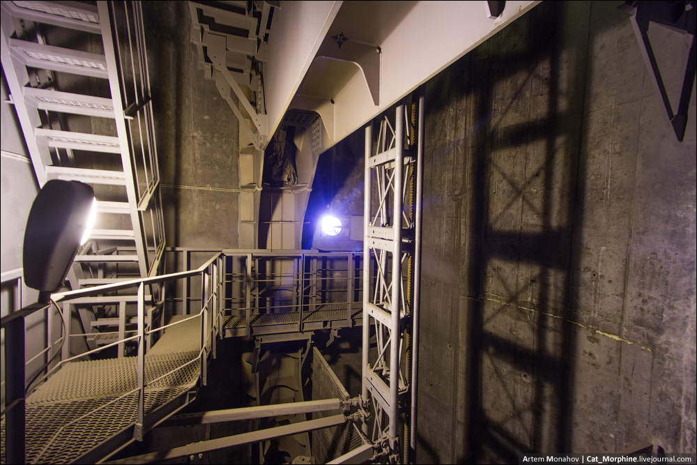 11. Так выглядит пилон моста изнутри. Грузовой лифт и лестница.