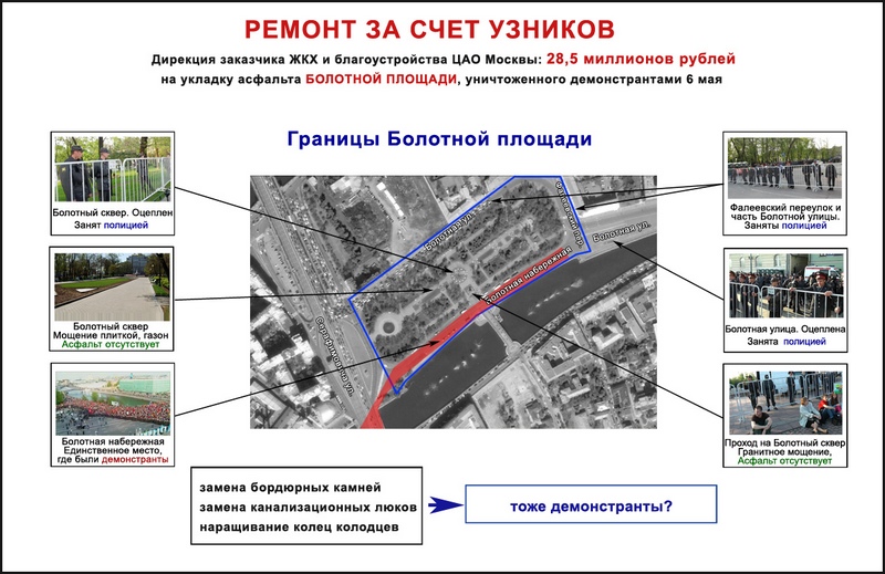 Болотная набережная, на которой находились демонстранты (больше их никуда не пустили), занимает 1/6 часть всей Болотной площади, которую якобы ремонтировали. События, которые привели к ущербу, происходили на пятачке, едва превышающем треть площади набережной.