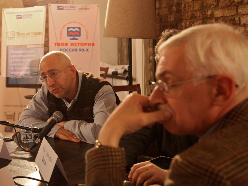 Николай Сванидзе: Мы презентуем образовательный портал «Твоя история», поскольку все больны историей, и посвящаем этот портал тем, кто собирается болеть вместе с нами. В связи с порталом речь идет об истории 90-х годов. Проблема со школьным преподаванием курса истории России 90-х годов достаточно очевидна и, прежде всего, связана с тем, что история этого периода в значительной части своей представляет собой еще и политику. Я должен сказать, что ваш покорный слуга, когда делал проект исторической хроники, дойдя до середины 90-х годов, столкнулся с тем же - я прощу прощения, не воспримите это как нескромность, - с тем же, с чем столкнулся в своё время А.К. Толстой, когда он предлагал общественному вниманию Историю Государства Российского и сказал, что ходить бывает склизко по камешкам иным. Я в этой склизкости тоже убедился. Скажем, предлагать людям какие-то трактовки истории второй половины 90-х годов, уже просто политической, очень сложно. Я представляю, насколько это сложно рядовому школьному учителю.