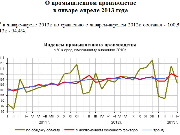 Фрагмент страницы Росстата Падение индекса промышленного производства в апреле, которое зафиксировала служба государственной статистики (апрель 2013 к марту - минус 5,6%) на первый взгляд вполне адекватно отражает общую ситуацию и в мировой, и российской экономике. Эта ситуация обозначается термином «стагнация», или даже «рецессия», и российская экономика как бы следует общемировому тренду. Однако в нашем случае все-таки есть некоторые особенности. Дело в том, что в апреле каждого года российская промышленность всегда демонстрирует падение выпуска продукции, и поэтому сравнение с общемировой ситуацией здесь не совсем уместно.