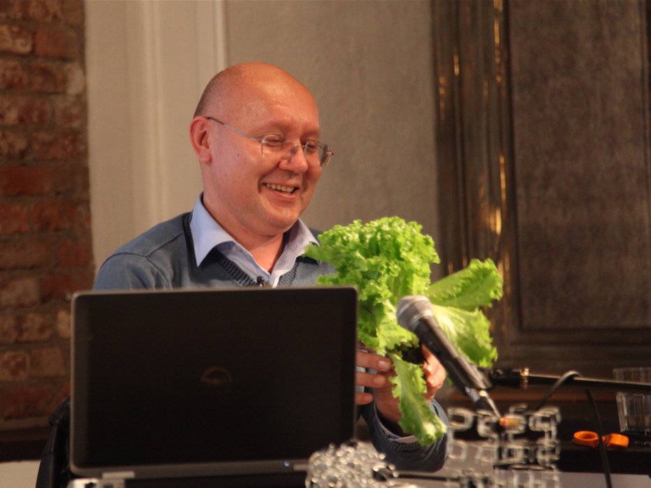Лист салата – тоже объект неевклидовой геометрии. Почему он волнистый, похож на юбку «годе»? Клетки, которые растут на периферии, растут быстрее из-за того, что они граничат со свободным пространством, у них больше возможностей для роста, чем у тех, что находятся внутри. Поэтому общий периметр растет быстрее, чем это нужно для того, чтобы лист был плоский, и его можно было бы уложить в плоскость.
