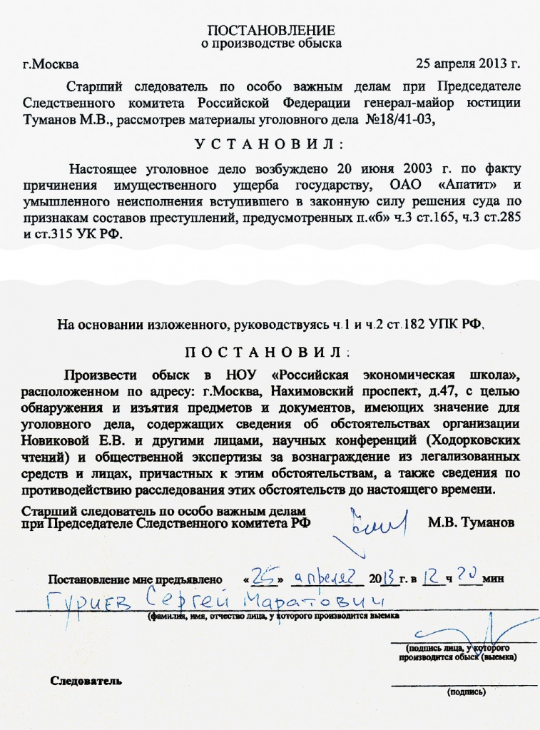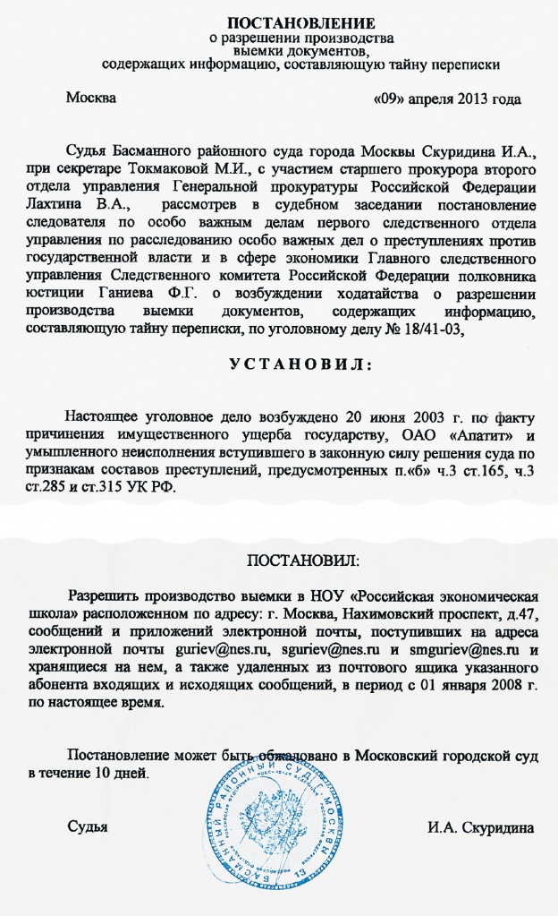 Спикер СК Владимир Маркин в телефонном разговоре с The New Times историю прокомментировал так: «Мне нечего сказать по Гуриеву. Где-то месяц назад его вызывали. Я просто спросил у следователя: вызывался он на допрос? Он подтвердил: вызывался. По-моему, по ЮКОСу, но я, честно говоря, не помню». Месяц назад, то есть 25 апреля, следователь приехал в РЭШ сам: Гуриеву сказали, что будет проведен очередной допрос, но следователь достал не только постановление о производстве обыска — оно обозначено именно 25 апреля, но и «Постановление о разрешении производства выемки документов, содержащих информацию, составляющую тайну переписки», от 9 апреля 2013 года: разрешение на выемку электронной почты дала судья Басманного районного суда Москвы Скуридина И.А., а прокуратуру на этом тайном заседании представлял старший прокурор Генпрокуратуры Лахтин В.А. — да-да, тот самый Лахтин, который исполнял роль государственного обвинителя на втором процессе по делу Ходорковского и Лебедева.