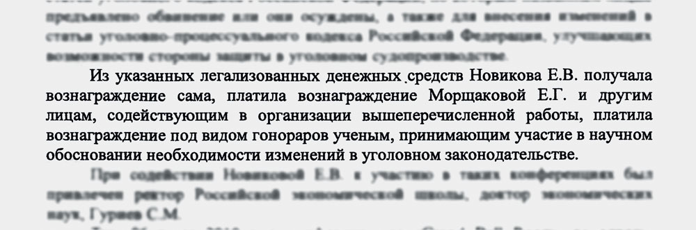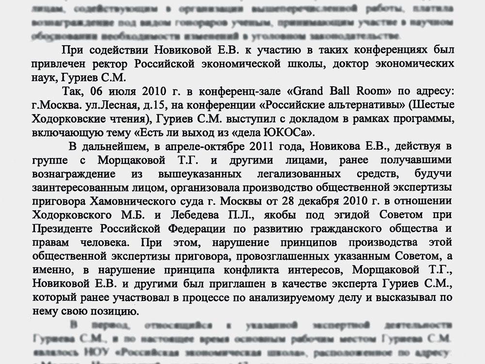 Тут, наконец, и появляется фамилия Гуриева: во-первых, 6 июля 2010 года он участвовал в Ходорковских чтениях в Москве с докладом «Есть ли выход из «дела ЮКОСа». (Гуриев участие в конференции подтверждает, но выступал он на сессии по перспективам российской экономики, а не по «делу ЮКОСа».) Во-вторых, был приглашен в качестве эксперта Советом при президенте по развитию гражданского общества и правам человека для «производства общественной экспертизы приговора Хамовнического суда г. Москвы от 28 декабря 2010 г.». Все. Про грант РЭШ 2003 года следователь благоразумно в постановлении не упоминает, зато появляется уже совершенно фантастическая фраза: «Был приглашен в качестве эксперта Гуриев С.М., который ранее участвовал в процессе по анализируемому делу и высказывал по нему свою позицию».