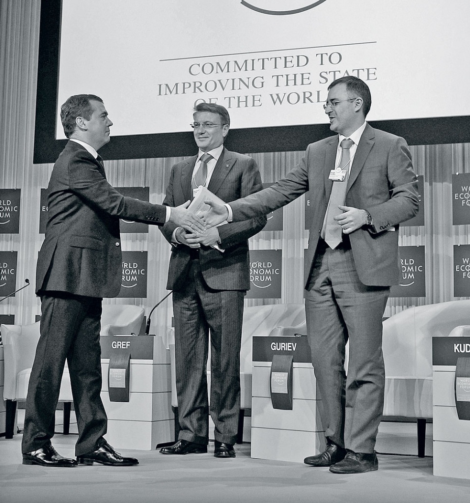 | 23 января 2013 г. Премьер Дмитрий Медведев, председатель правления Сбербанка России Герман Греф и ректор Росссийской экономической школы Сергей Гуриев (слева направо) на пленарной сессии Всемирного экономического форума «Сценарии развития Российской Федерации» |