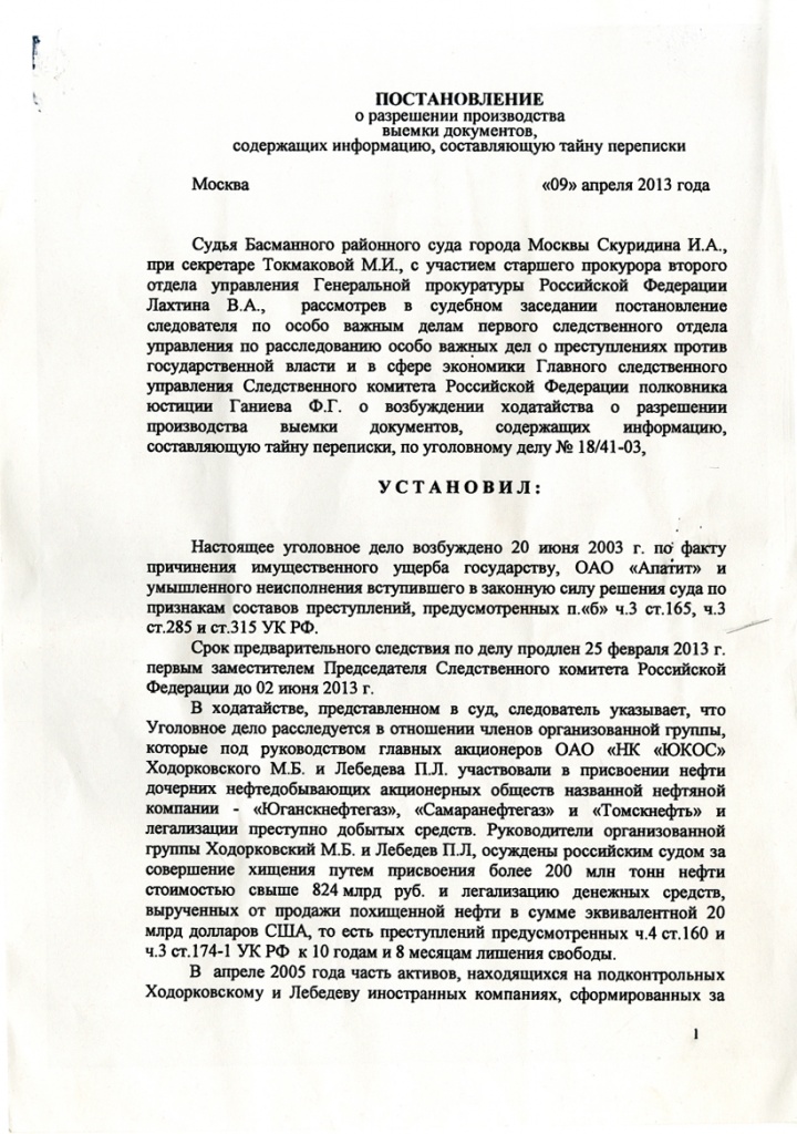 Тексты обоих протоколов — один, от 25 апреля, подписанный следователем М.В.Тумановым, другой, от 9 апреля — судьей И.А Скуридиной, — за исключением первого абзаца и заключительной, постановляющей части идентичны: это один и тот же текст, даже ошибки не сочли нужным поправить. Например, судья Конституционного суда в отставке Тамара Морщакова на второй странице, второй абзац протокола за подписью следователя, и на второй странице, пятый абзац протокола за подписью судьи (в этом документе шапка документа длиннее, оттого и абзацы на следующей странице сместились) поименована как «Морщакова Е.Г.». (см. фотокопию из документа ниже), спустя два абзаца и в том и в другом протоколе уже правильно — «Морщакова Т.Г.» Другими словами, разрешение на нарушение одного из важнейших конституционных прав — права на тайну переписки — судья Басманного суда подмахнула не глядя.