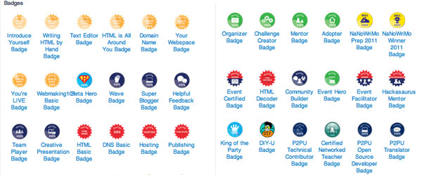 Репутация. В традиционном варианте это дипломы, сертификаты и степени. В пиринговом варианте этого всего нет. В качестве своего рода суррогата появилась и развивается система бейджей. Бейдж – это, собственно, символическая картинка, которой присвоено то или иное значение. Значение может быть любое: от «просто хороший человек» до «отличный блоггер» или «веб-мастер». Системы бейджей бывают локальными, то есть они действуют только внутри какого-то одного сообщества (в Codecademy, например) или более общими. Сейчас в этом деле тон задала Mozilla, создав систему «открытых бейджей» (Open Badges), в которую начали интегрироваться бейджи партнерских проектов вроде P2PU. Бейдж может создать кто угодно (на P2PU, опять же, специальный курс).
