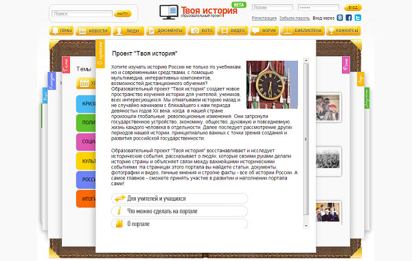 Тут можно вспомнить отечественную инициативу, никак не связанную с P2PU, но, тем не менее, использующую некоторые сходные принципы. Речь идет о проекте «Твоя история», History4you. Он появился относительно недавно, однако уже видно, что по ряду признаков очень напоминает пиринговую платформу. В настоящий момент «Твоя история» предлагает к изучению преимущественно российскую историю 1990-х гг.: «Уникальность периода 90-х годов состоит в том, что эта история живая. Живая история хороша тем, что есть очевидцы событий и опасна тем, что эти очевидцы абсолютизируют свой взгляд на эти вещи… Портал дает возможность ученикам посмотреть на разные взгляды разных очевидцев и убедиться, что в истории есть много живого, и это не линейный процесс, а большая мозаика», - пояснил один из создателей ресурса, профессор Департамента образовательных программ НИУ ВШЭ Андрей Иоффе.