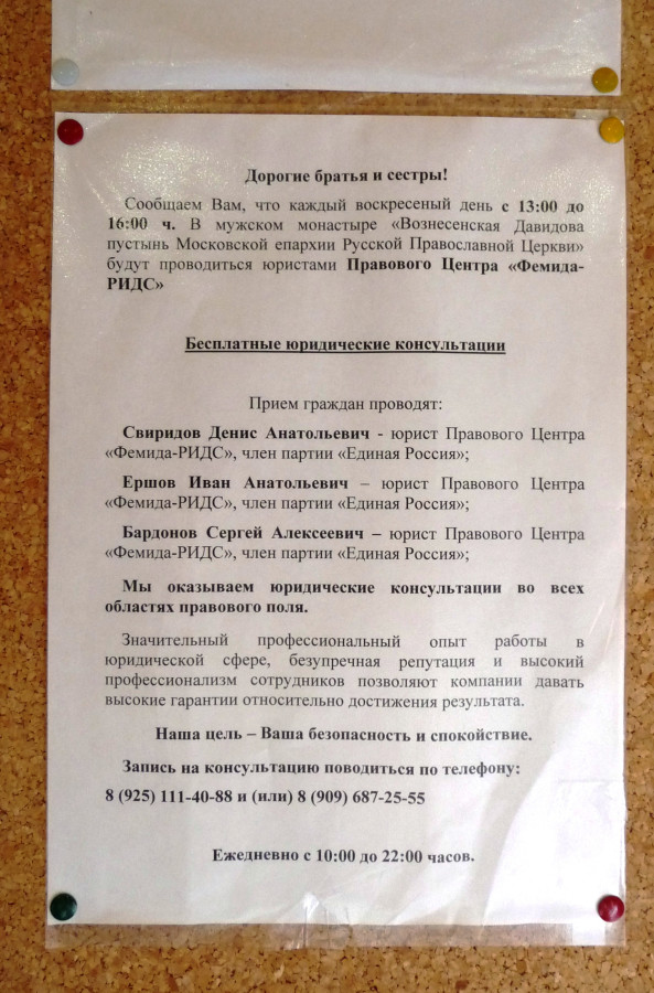 Как известно, православие не имеет отношения ни к каким политическим взглядам и уж тем более к политическим организациям. Поэтому совсем не понятно, зачем понадобилось служителям подворья в объявлении указывать принадлежность этих юристов к одной из политической организации, к стати, зарекомендовавшей себя в народе не самым лучшим образом.