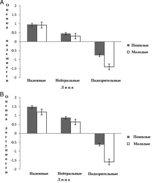 Оказалось, что пожилые люди оценивали надежность и доступность лиц из надежной и нейтральной групп так же, как молодые участники эксперимента. Что же касается подозрительных незнакомцев, пожилые были к ним менее критичны и по шкале надежности поставили им среднюю оценку — 0,75, в то время как молодые — 1,4. В оценке доступности подозрительных личностей участники разного возраста также разошлись.
