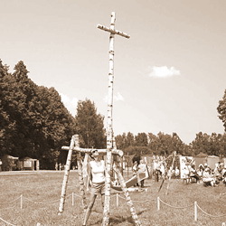 Поляна сверкает росой. Съезжаются палатки, лотки, качели, ставятся малые сцены – всё возится, стучит, тянется. Аист уже облетает свои владения, поглядывая, что там и как, майский жук, не перевернув календаря, ткнётся в твой июньский лоб. Стрекозы, как малые аисты (так сбивается в масштабах взгляд) перечеркивают небо над Поляной. Уж и не утро, а молодой день. Пора к Александру Сергеевичу.