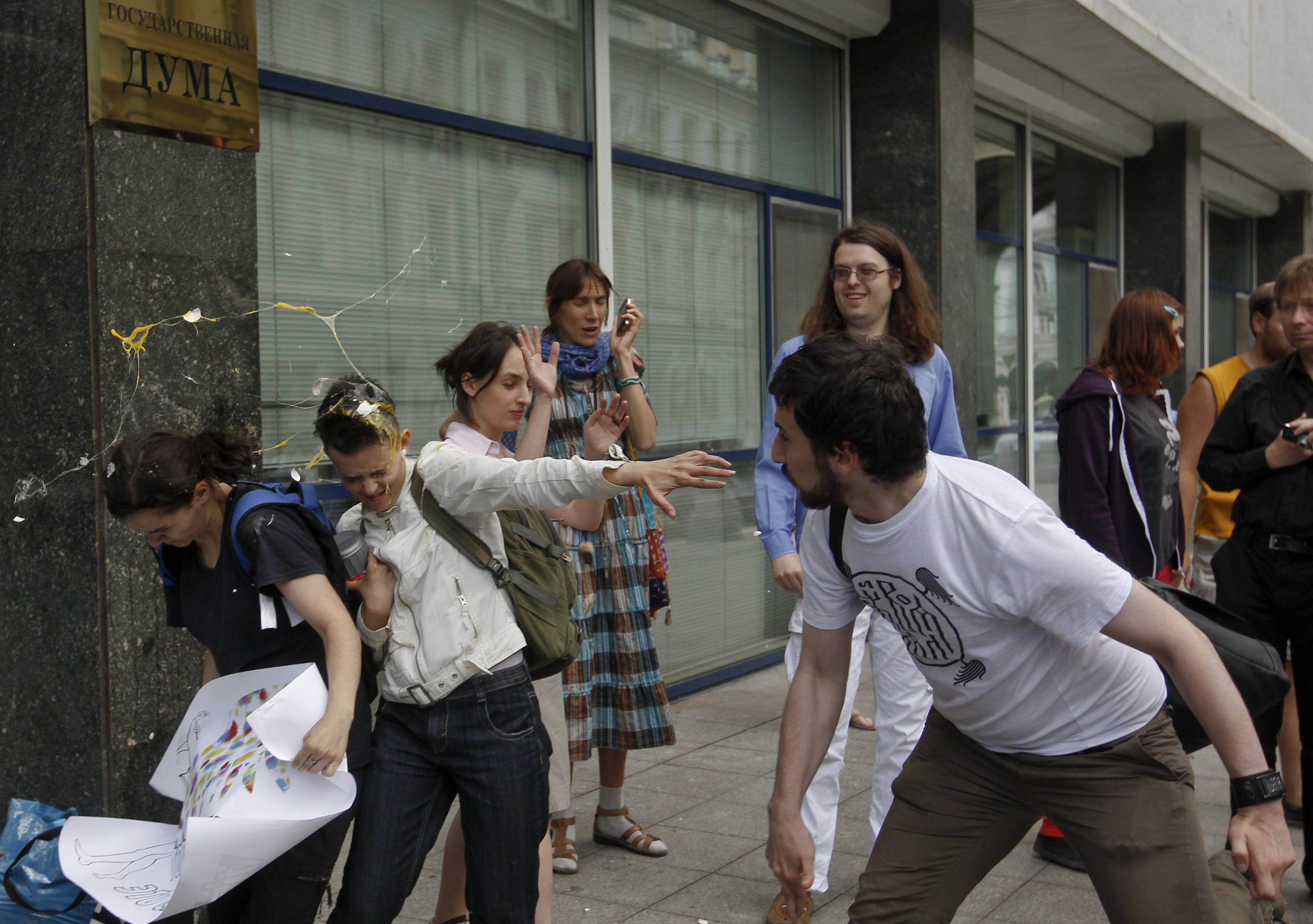 У здания Госдумы во вторник ЛГБТ-активисты собрались, чтобы выразить протест против закона о запрете пропаганды гомосексуализма. Были задержаны около 30 активистов и их сторонников, а также несколько человек, пришедших воспрепятствовать протестной акции.