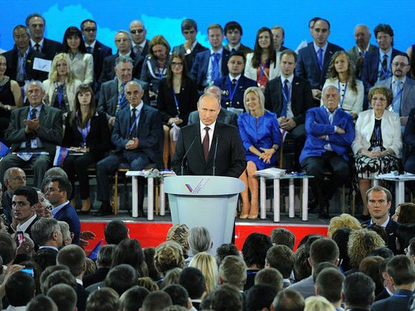 На съезде ОНФ. Фото: kremlin.ru Любопытнее, что устав говорит о целях и движения. Первым пунктом стоит «содействие единению <…> и гражданской солидарности во имя исторического успеха России в XXI веке». Не для а во имя.
