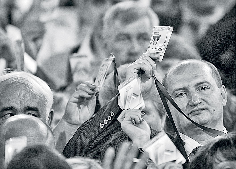 «Коллеги! Давайте не будем вносить в конструктивное собрание деструктив, — примирительно заметила тележурналист из Ставрополя Ольга Тимофеева, свежеизбранный сопредседатель ОНФ. — Я предлагаю добавить такую норму: исключать тех, кто будет порочить честь фронта. Хочется, чтобы не было коррупционеров, негодяев. Чтобы люди выступали за страну, а не пытались очки себе набрать». Напоследок всех участников заседания предупредили, что главный день съезда обещает быть тяжелым: придется много стоять, поэтому дамам не рекомендовали надевать туфли на каблуках. Еще настоятельно рекомендовали подучить слова государственного гимна — «а то раздавать листочки со словами неловко».