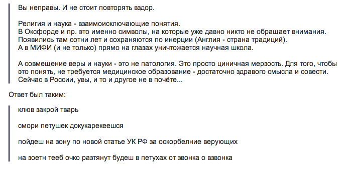 Наш сегодняшний школьник – возможно, будущий абитуриент кафедры теологии МИФИ, некогда ведущего московского института, где учились Окунь, Горьков и Файнберг – теперь национального университета, освященного патриархом (как говорят, святою молитвою со словами: "Да стоять храмине сей вечно на камне сем..."). Последние ученые, которые не ищут утешения в религии, оттуда уходят, потому что им стыдно. Пытаясь объяснить свою позицию, они оказываются вовлеченными в постдокинзовские научно-религиозные споры, документальный образчик которых приведен ниже: