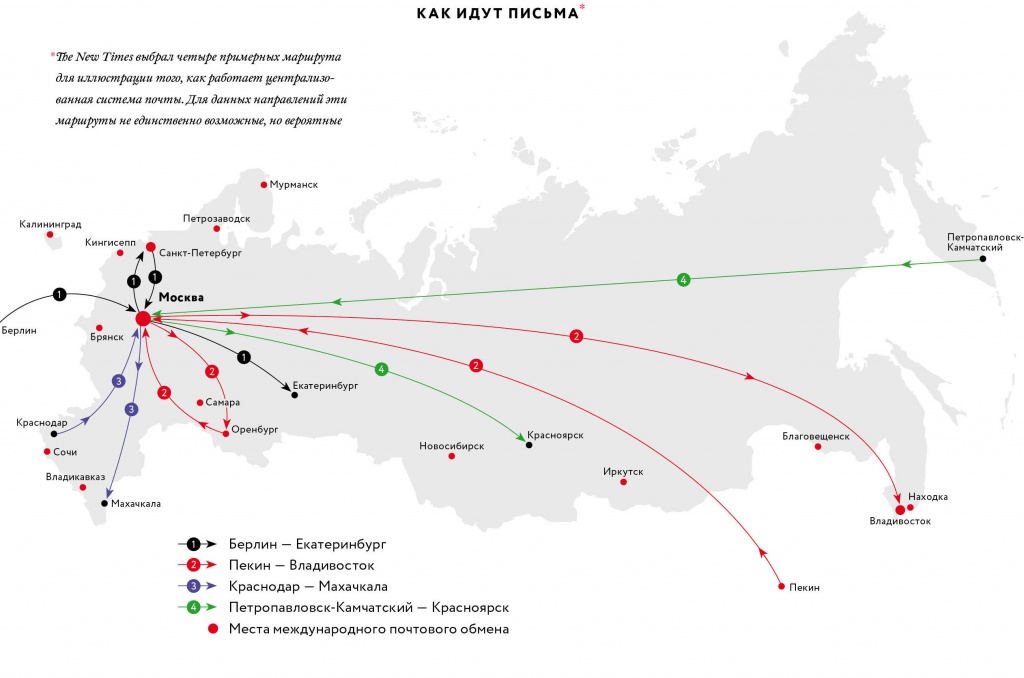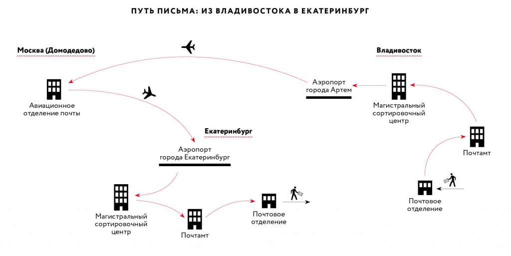 Другой пример: письмо из Владивостока в Екатеринбург. Идет оно так. Из почтового отделения письмо везут в почтамт во Владивостоке, оттуда машиной в магистральный сортировочный центр — это тоже Владивосток. Дальше — самолетом в Москву, в Домодедово: отсюда, из авиационного отделения почты, после сортировки его, наконец, отправят в Екатеринбург. Уходит на это минимум шесть дней — это если по дороге ничего не случится. Если случится — письмо может идти неделями и месяцами. И такой или похожий путь — через Москву — проходит 70% писем и посылок, отправляемых внутри страны.