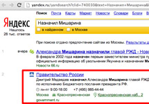 Появившаяся утром в пятницу аннотация к одной из ссылок на сайт правительства в поисковой выдаче "Яндекса", в которой говорилось о назначении Александра Мишарина главой РЖД, связана с особенностями формирования аннотаций (так называемых сниппетов) в поисковике. Об этом Ленте.Ру рассказал пресс-секретарь компании Очир Манджиков.