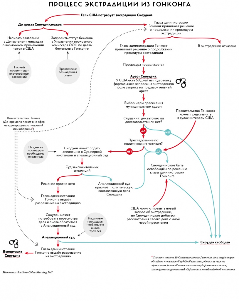 Однако, если разобраться, Гонконг может оказаться вовсе не такой спокойной гаванью, какой представлял его Эдвард Сноуден. С момента перехода Гонконга под суверенитет КНР в 1997 году китайское руководство проводит в жизнь принцип «одна страна, две системы», по которому бывшая британская колония и правда пользуется достаточно широкими свободами. Тем не менее административное управление в Гонконге завязано на Пекин. «КНР содержит гонконгскую полицию, — пояснил журналу завотделением востоковедения Высшей школы экономики академик РАЕН Алексей Маслов, — было много случаев, когда китайских бизнесменов, пытавшихся скрываться от правосудия в Гонконге, в два дня отправляли на родину. Что касается экстрадиции Сноудена в США, то тут тоже решение будет приниматься в Пекине — Гонконг никогда не возьмет на себя такую ответственность».